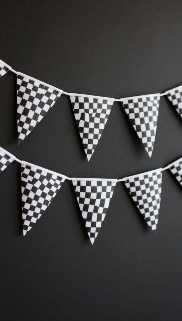 A classic racing touch that never goes out of style. Cut out triangles from black and white checkered fabric or paper, then string them together to create a festive bunting banner. Hang it above the main party area, the dessert table, or even along the fence in your yard. Pro tip: Mix in some solid red or orange triangles for a pop of color; it breaks up the monochrome a bit. This simple decoration is effective and screams “race day!”