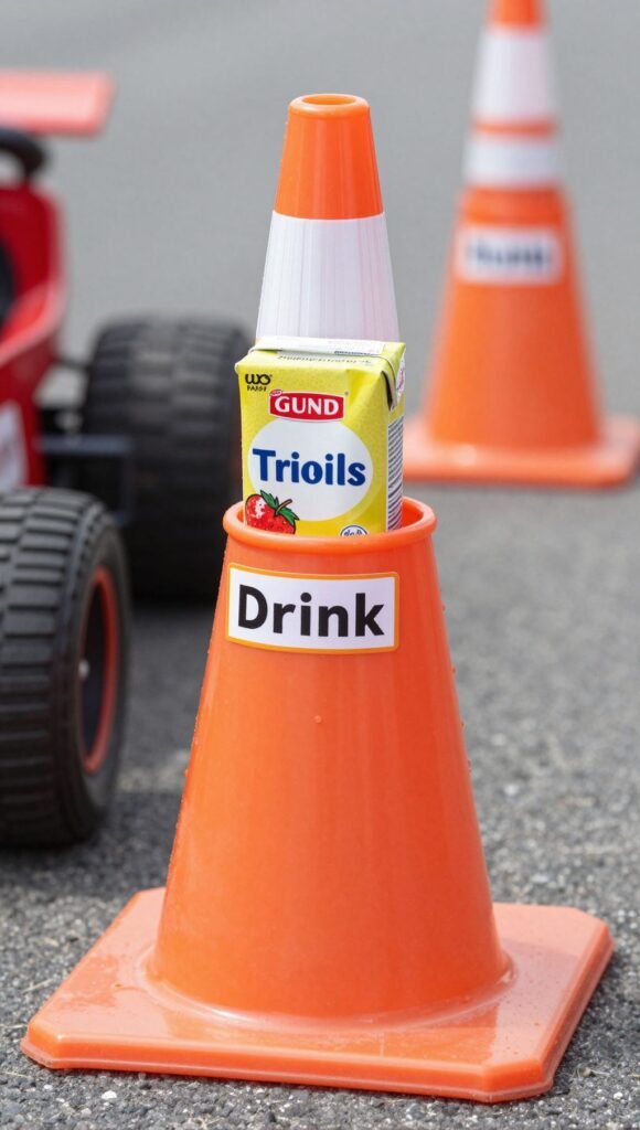 Hydration is key, even for tiny racers burning rubber. Find small, plastic orange traffic cones, flip them upside down, and use them to hold juice boxes or water bottles. You can even label them with cheeky names like “Fuel Station.” Pro tip: Fill a larger cone with ice for a cool presentation, but watch out for condensation. It’s practical, perfectly thematic, and looks pretty cool on your snack table.