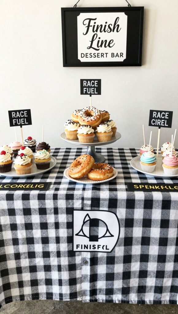 Sweet victory awaits all the champions. Decorate your dessert table like a finish line with a black and white checkered tablecloth. Label treats as “Race Fuel Cupcakes,” “Winner’s Circle Donuts,” or “Spark Plug Cake Pops.” Pro tip: Use small toy cars as cake toppers or arrange them around the base of platters; they can double as party favors later. Everyone loves dessert, and this makes it extra special and on-theme.