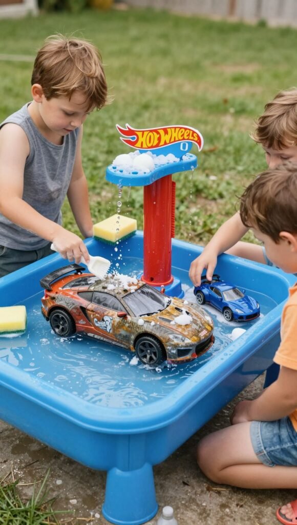 For those tired, grimy race cars (and perhaps a few messy kids!). Set up a small water table or kiddie pool with sponges, brushes, and mild soap for kids to “wash” their Hot Wheels cars. You can even have a designated drying station with paper towels. Pro tip: Add a few drops of child-safe bubble bath for extra sudsy fun, just watch for slippery surfaces. This activity is engaging, keeps kids busy, and surprisingly therapeutic.