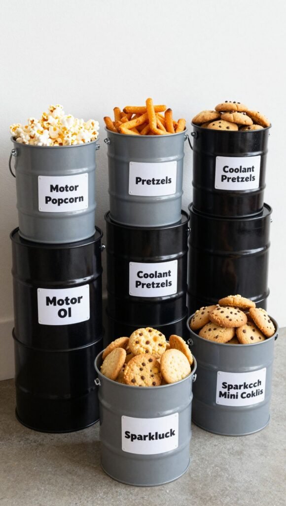 Fueling up has never looked so cool. Grab some small, clean metal buckets (or paint plastic ones grey/black) and label them with fun names. Think “Motor Oil Popcorn,” “Coolant Pretzels,” or “Spark Plug Mini Cookies.” Pro tip: Line the buckets with themed napkins or parchment paper for hygiene and easy cleanup. Nobody wants greasy motor oil on their snacks! It’s a creative and thematic way to serve all your delicious treats.