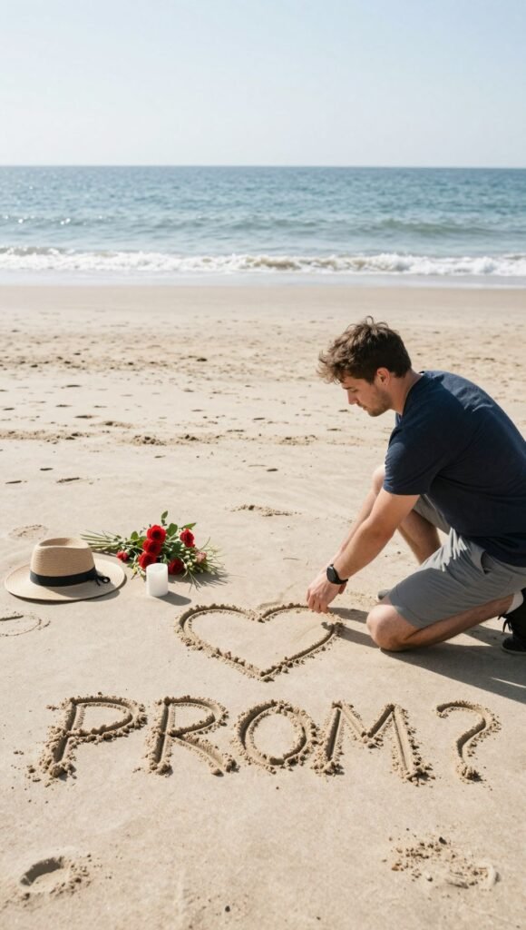 Write “Prom?” in the sand (check the tides first, nobody wants their proposal washed away). Or, set up a small picnic with a blanket and some snacks, and have the question written on a banner or a custom beach ball. It’s picturesque, relaxed, and feels like a mini getaway. Just make sure the weather cooperates.