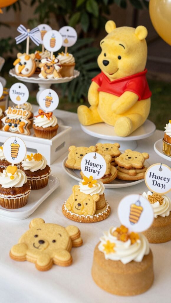 No Pooh party is complete without a nod to his favorite treat. Set up a dessert bar overflowing with goodies, all labeled with cute “hunny” tags. Think mini honey cakes, sugar cookies shaped like bees or Pooh, and even little jars of actual honey for guests to take home. It’s truly a sweet spread.