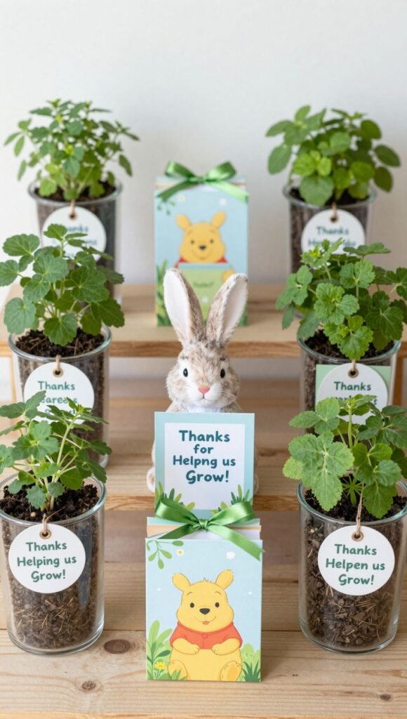 Send your guests home with something sweet and green, just like Rabbit would appreciate. Small potted herbs, seed packets with a “Thanks for helping us grow!” tag, or even tiny jars of homemade jam make perfect favors. It’s a thoughtful and eco-friendly thank you.